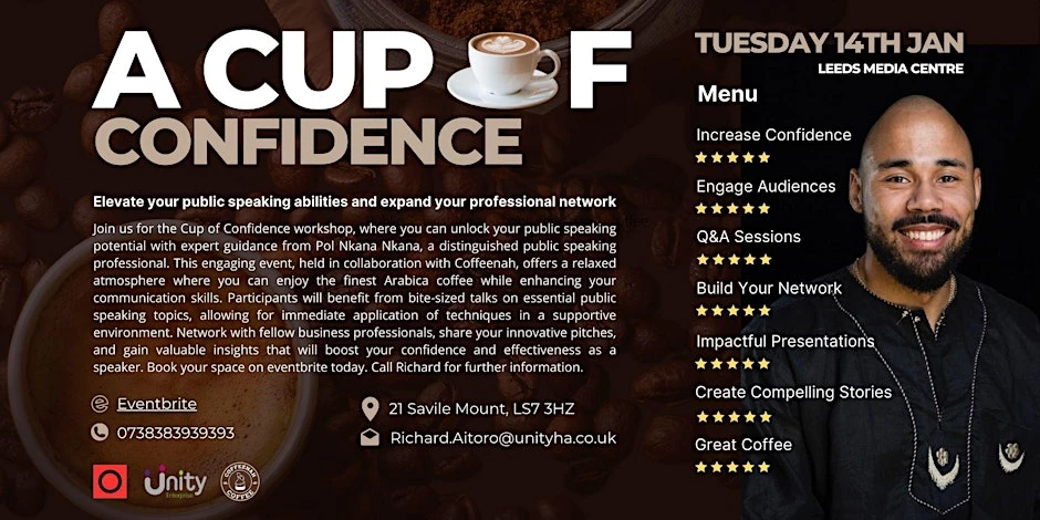 Richard Aitoro, Unity Enterprise Business Adviser: “A Cup Full of Confidence will enable participants to benefit from bitesized talks on essential public speaking topics, whilst networking with fellow business professionals over a cup of magnificent coffee – we are grateful to Coffeenah for their support.”